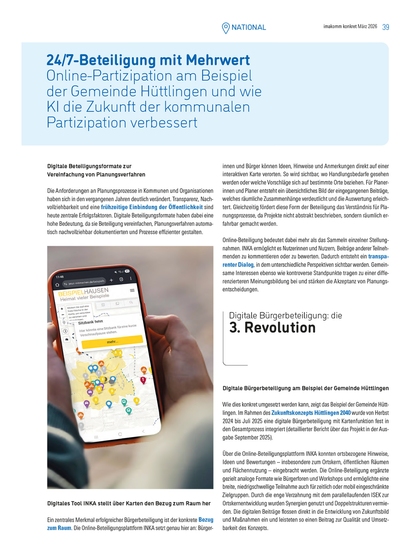 Online-Partizipation am Beispiel der Gemeinde Hüttlingen und wie KI die Zukunft der kommunalen Partizipation verbessert. Ein imakomm und tetraeder.com Artikel aus der KONKRET März 2026 Ausgabe: