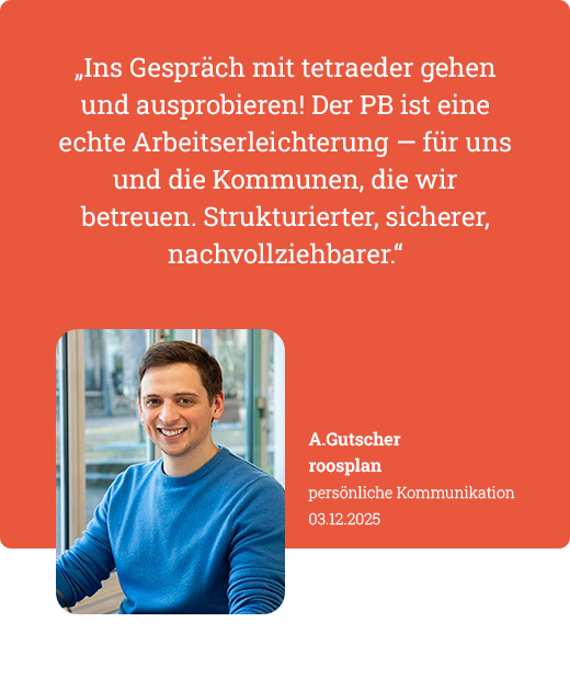 Im Austausch mit tetraeder.com wurde schnell klar: Der PB bietet genau das zentrale, strukturierte System, das das Büro gesucht hatte – ohne eigene IT-Aufwände.